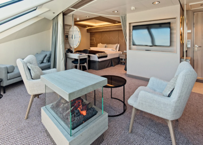 - Aft-facing apartmány suites v zadnej časti lode s vlastnými virivkami na terase